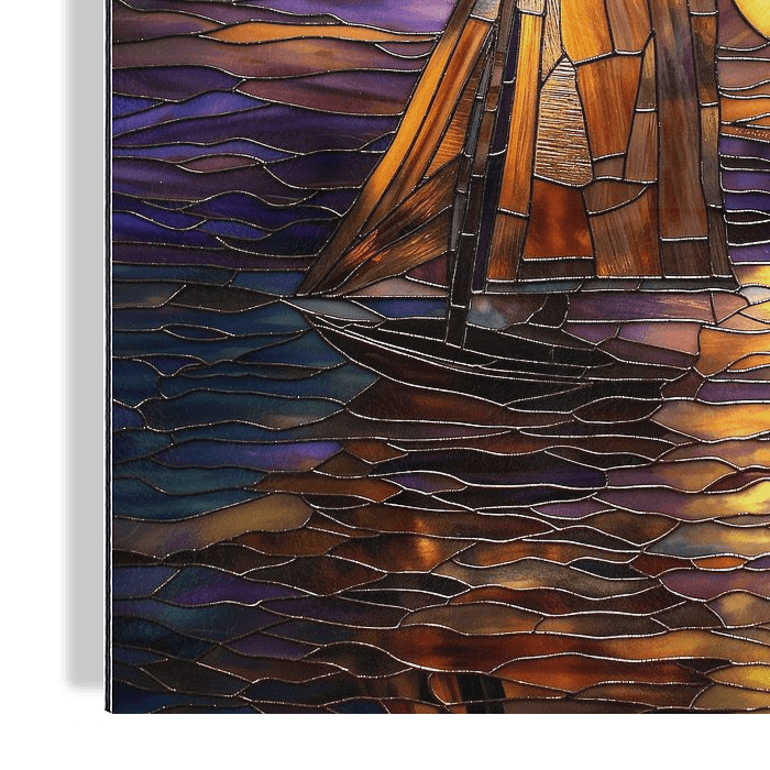 Glasmalerei mit der Darstellung eines Segelboots und der untergehenden Sonne