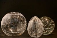 Eine zurückhaltende und elegante Komposition aus drei Glasobjekten, von denen jedes einen einzigartigen Charakter besitzt. Die subtilen Rissstrukturen und Luftblasen fangen das Licht auf besondere Weise ein und erzeugen so ein Spiel aus Reflexion, Tiefe und Transparenz. Vor dem dunklen Hintergrund treten die Formen kraftvoll hervor,…