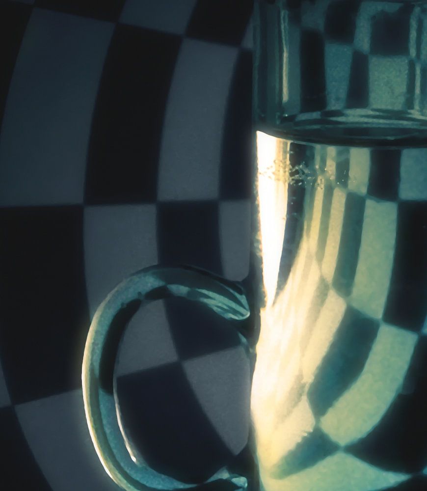 Ein Glas transparent Becher mit Wasser auf einem Hintergrund von schwarzen und weißen Zellen. Brechung des Bildes im Wasser. Abstraktion.