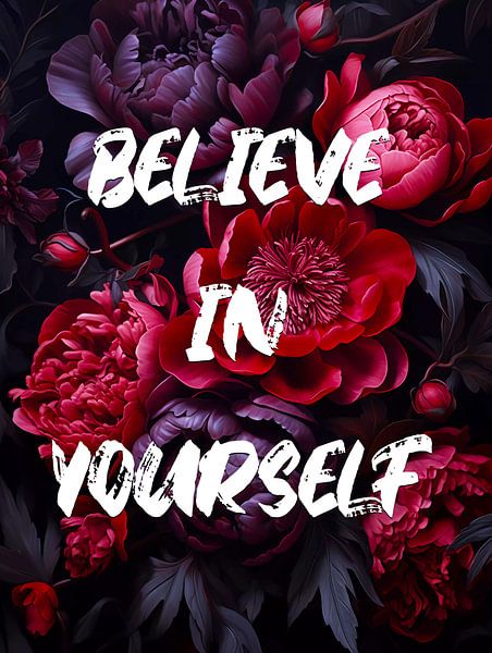 Glaube an dich selbst, Zitat mit Pfingstrose Blumen im Hintergrund