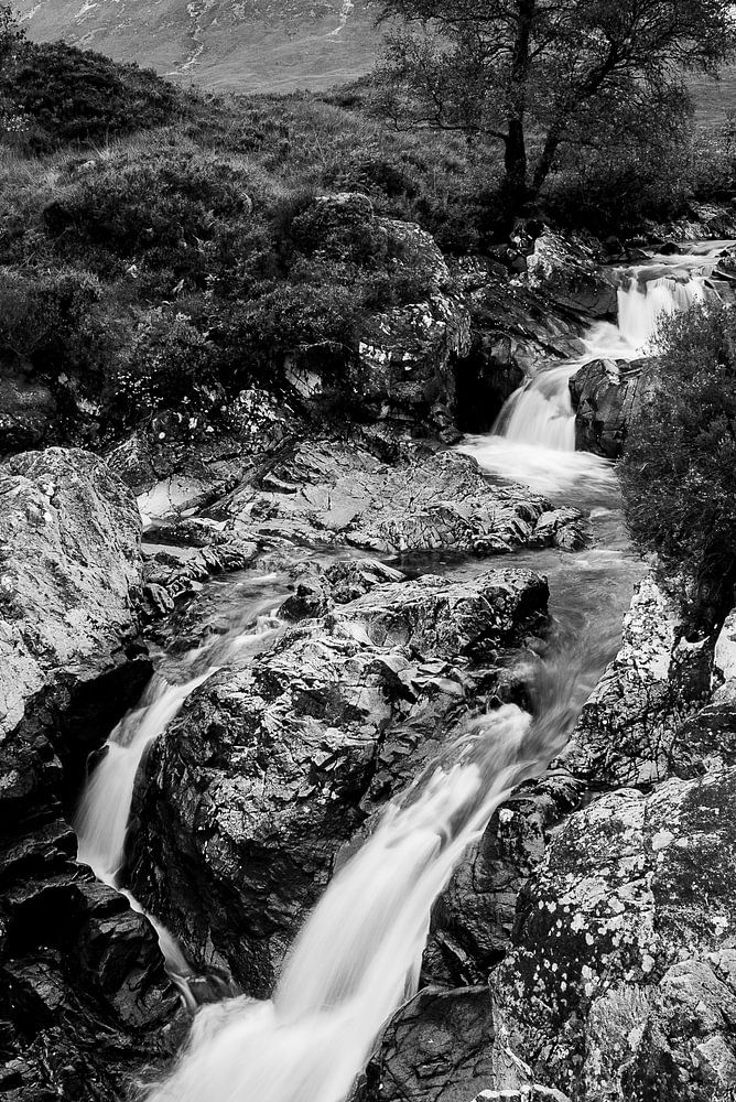 Dieses Schwarz-Weiß-Foto mit Langzeitbelichtung wurde am Glencoe-Wasserfall im schottischen Hochland aufgenommen. Die schottische Landschaft ist nicht sehr farbenfroh, aber dieses Schwarz-Weiß-Foto zeigt all die komplizierten Kontraste sehr gut.