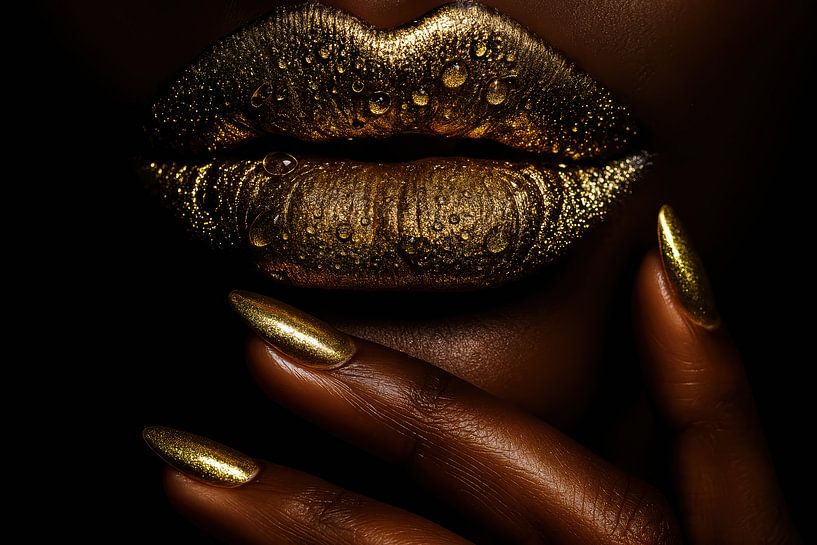 Im Mittelpunkt steht eine Nahaufnahme von glitzernden goldenen Lippen, während feine Wassertropfen die metallische Oberfläche betonen. Eine anmutige Hand mit goldfarbenen Nägeln berührt subtil den Mund und fügt ein elegantes Linienspiel hinzu. Der dunkle Hintergrund verstärkt den starken Hell-Dunkel-Kontrast und verleiht dem Glanz Tiefe…