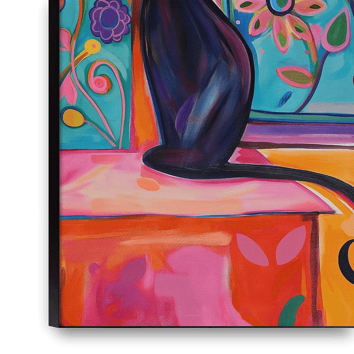 Happy Cat" ist eine Einladung, sich in eine Welt voller Lebendigkeit und Charme zu begeben. Eine schwarze Katze, deren Haltung ebenso geheimnisvoll ist wie ihre nächtlichen Abenteuer, starrt direkt in den Raum. Ihre Augen leuchten vor dem farbenfrohen Hintergrund eines Blumengartens, der jede Ecke des Bildes mit fröhlichen Farbtönen und…