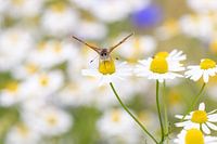 Sehr scharfe Makroaufnahme eines Glühwürmchens, das aus einem Gänseblümchen trinkt