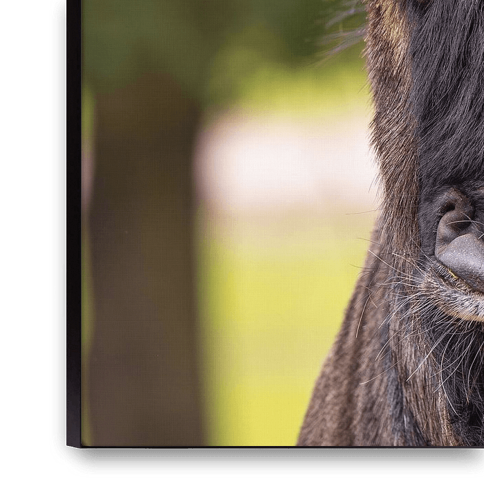 Bestelle dieses Porträt Gnus im Detail: Die wilde Majestät der Savanne von Triki Photography als Reproduktion auf Leinwand, Alu-Dibond, als Poster, Fototapete oder Acrylglasbild.