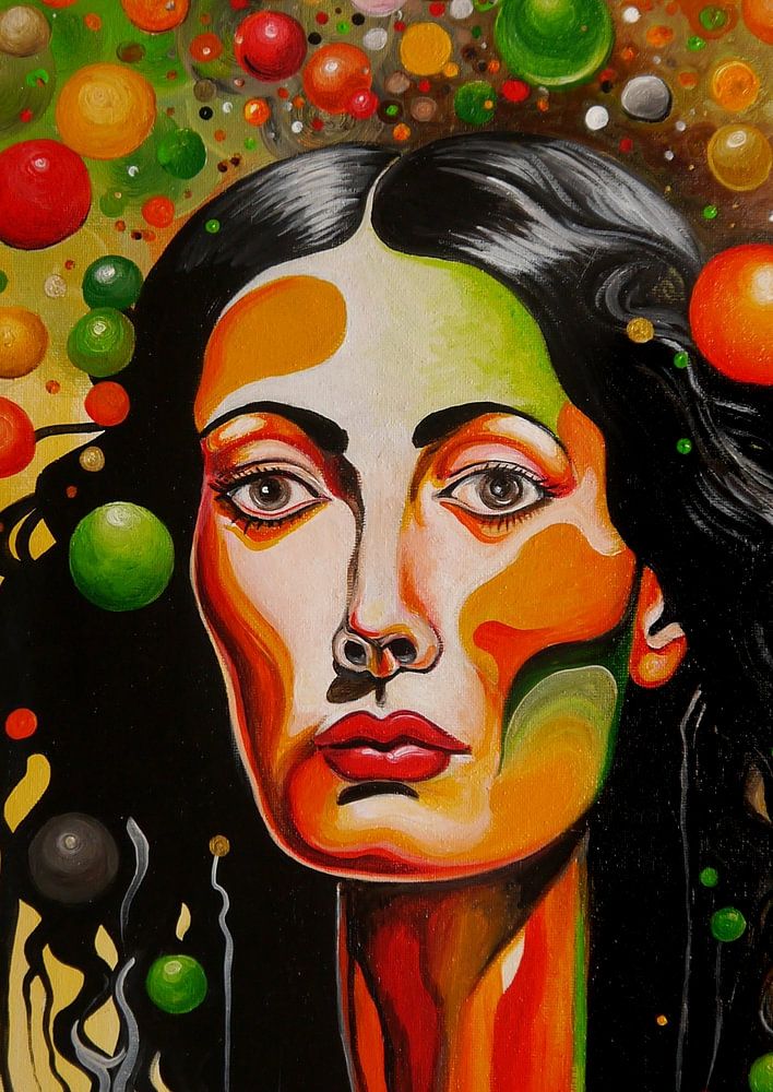 Aus der Serie: "Besondere Frauen". Es ist ein Gemälde im surrealistischen Stil. Detailreich gemalt in leuchtenden Farben, inkl. Goldakzente. Das Motiv zeigt eine ernst blickende junge Frau in schwarzem Haar, deren Kopf, Hals und Haar von Kugeln (Planeten), die umherschwirren, umgeben sind. Hinzu fällt das Haar der Frau seitlich in Strähnen herab. Da es sich um eine surrealistische Darstellung handelt und somit ein Werk zwischen Wirklichkeit und Illusion zeigt, bleibt es dem Betrachter überlassen, worauf er den Fokus legt. Auf jeden Fall ein ungewöhnliches Frauen-Portrait, das weiter entwickelt wird, mit anderen Gemälden. Dieses ausdrucksstarke Bild zeigt die Göttin des Universums voll mit Planten – so die Idee. Explosionsartig kreisen die Planeten offenbar ziellos umher. Eine kosmische Göttin dargestellt als weibliche Person mit überzeichnenden Proportionen (Hals), inmitten des Planten-Chaos, das ist ihr Refugium!