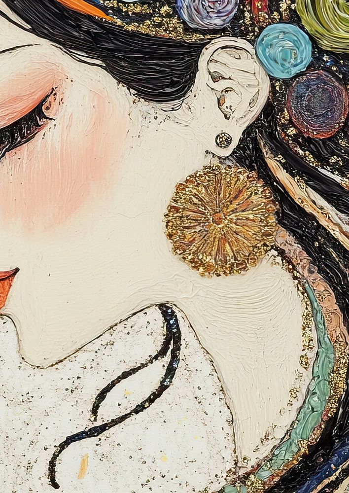 Details: Frauenbild, modernes Portrait, Textur, farbenfroh, Profilierung, Kunst, elegante Dame, Goldschmuck, Ästhetik, visuelle Kunst