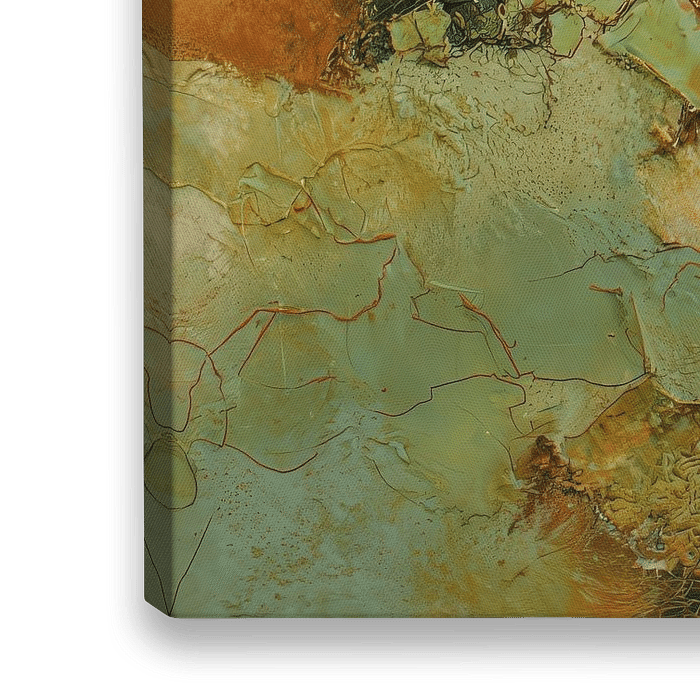 Ein abstraktes Gemälde in Gold-, Orange- und Grüntönen strahlt Wärme und Ausdruckskraft aus.