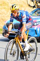 Remco Evenepoel bei der Arbeit auf seinem goldenen Fahrrad. Die Regenbogenfarben auf seinem Ärmel und ein goldener Helm. Holen Sie sich jetzt dieses exklusive Foto zu sich nach Hause, als Hommage an seine Jahre im Wolfsrudel-Team.
