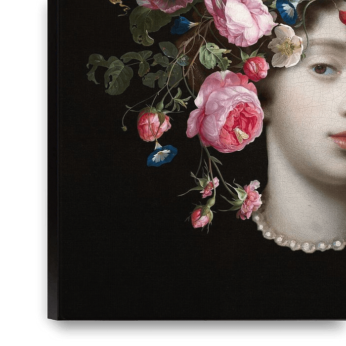 Dieses blumige Porträt ist eine Collage aus Bildern, die verschiedenen alten Meistern des Goldenen Zeitalters der Niederlande entnommen sind.