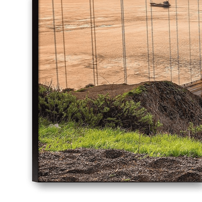 Das erste Licht breitet sich über die Meerenge aus, während sich die Golden Gate in warmen Kupfertönen erhebt. Der Turm steht deutlich über der Landzunge, die Kabel ziehen eine präzise Linie über das ruhige Wasser. Schauen Sie genau hin, und Sie werden einen sanften Schimmer auf der Bucht, eine sanfte Wolkentextur in Horizontnähe und feine Glanzlichter entlang der Nieten sehen, wo die Sonne zum ersten Mal den Stahl berührt.