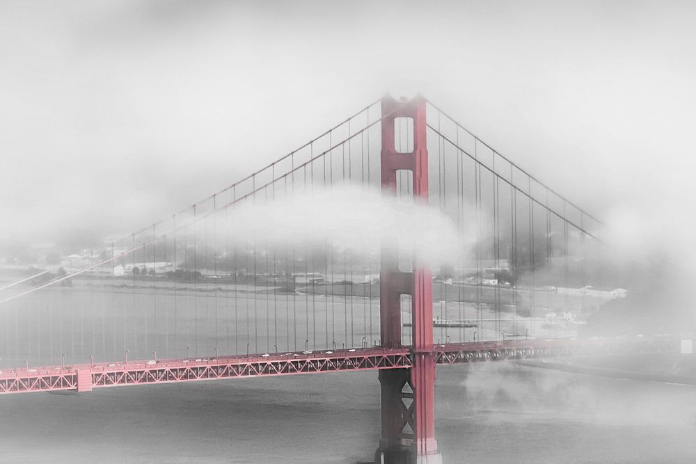 Klassische Impression von der in Nebel gehüllten Golden Gate Bridge. Dieses Phänomen lässt sich besonders im Sommer, zwischen Juni und September, wenn die kalten Winde des Pazifiks auf die warme Luft Kaliforniens treffen, beobachten.