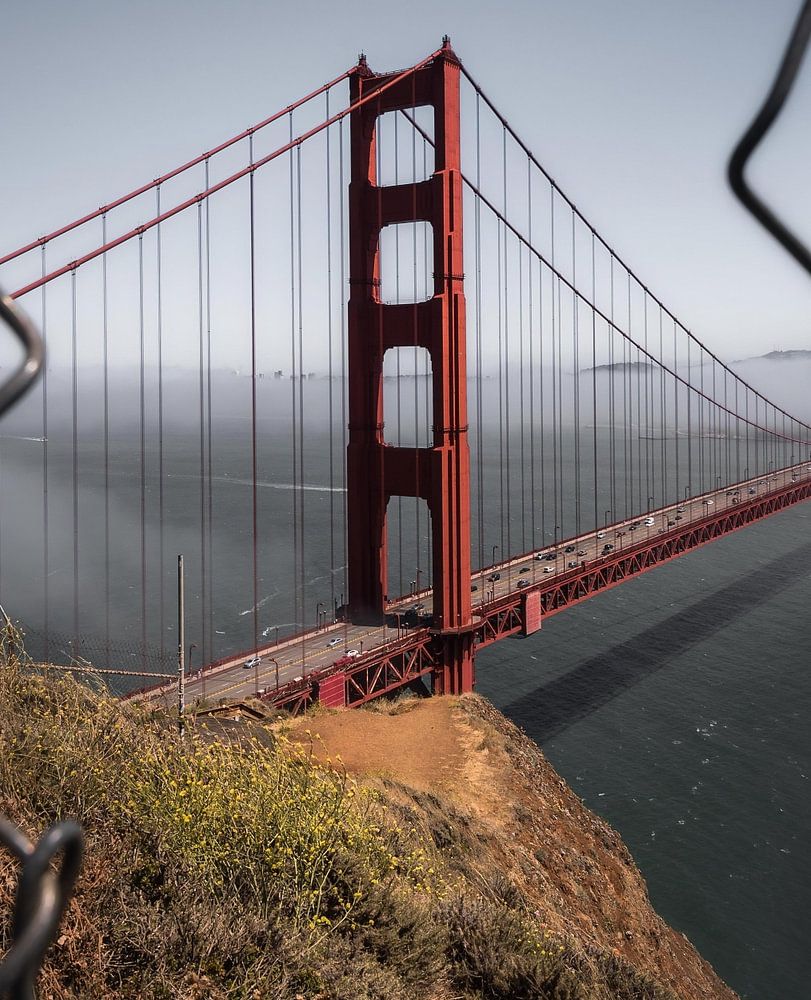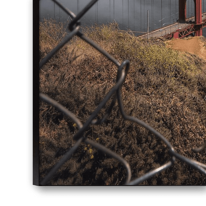Von einem hohen Aussichtspunkt aus sieht man die Golden Gate durch ein Rautenmuster aus Metallgitter. Das Gitter schafft einen kühnen Vordergrund, der die Aufmerksamkeit auf den Turm und die Linie des Decks beim Überqueren des offenen Wassers lenkt. Der Nebel, der über dem Kanal liegt, macht den Turm in der Ferne weicher und verleiht der Spannweite mehr Größe. Der Kontrast zwischen rauem Draht und glattem Stahl macht die Ansicht zu einer Studie von Textur und Form.