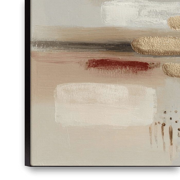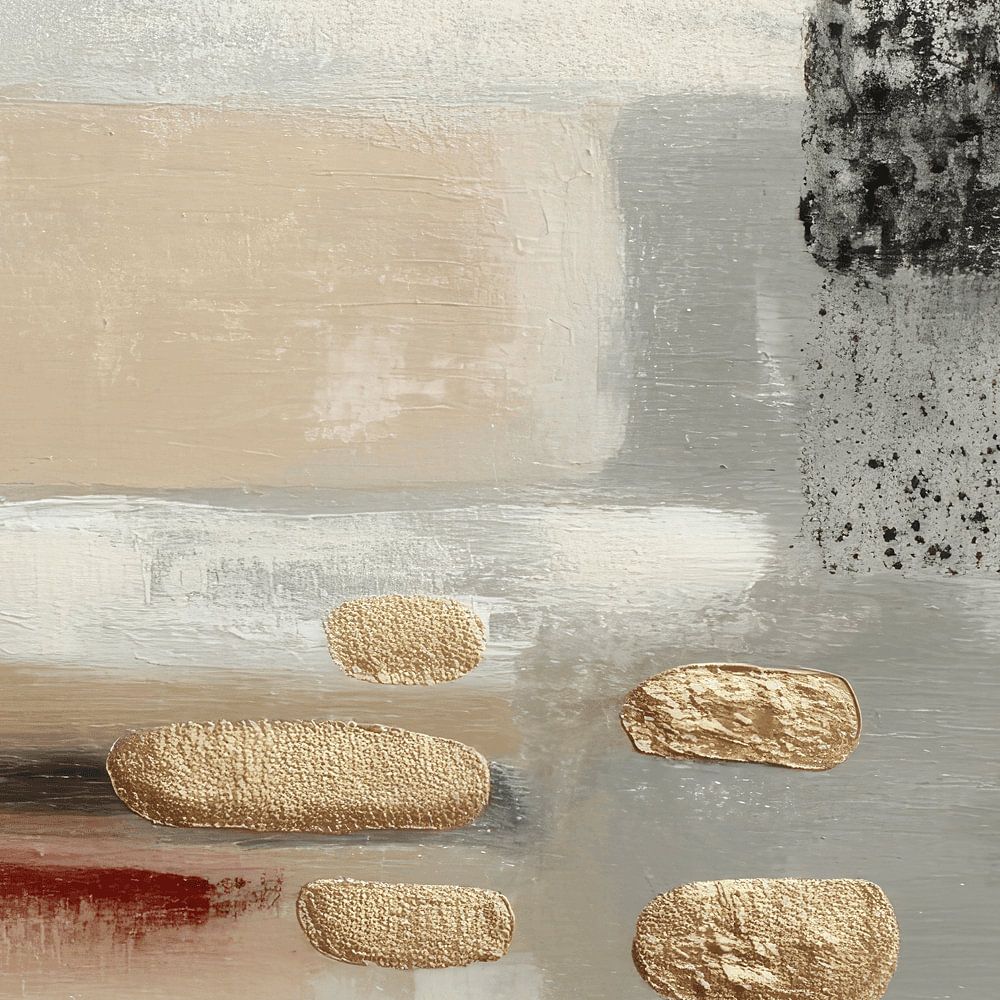 Golden Pebbles ist ein minimalistisches abstraktes Kunstwerk in sanften Nude- und Grautönen, kombiniert mit luxuriösen Goldakzenten. Organische, runde Formen in Beige, Weiß und Grau schweben über die Oberfläche, während die reliefartigen goldenen "Kieselsteine" das Licht subtil einfangen. Ein kleiner Hauch von warmem Rotbraun verleiht…