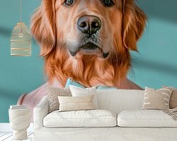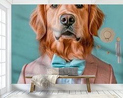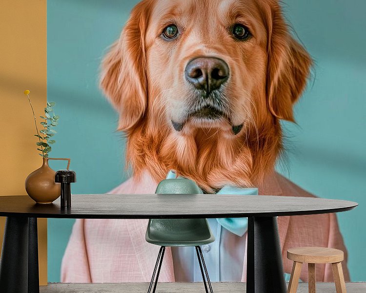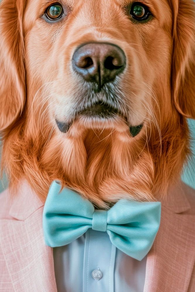Ein majestätischer Golden Retriever erfüllt den Raum mit Charme und Eleganz. In einem schimmernden, rosafarbenen Anzug und einer himmelblauen Fliege strahlt er eine stilvolle Gelassenheit aus. Sein warmes, goldenes Fell und die treuen Augen lassen ihn wie einen edlen Gentleman erscheinen, bereit für eine festliche Angelegenheit oder ein elegantes Abendessen.