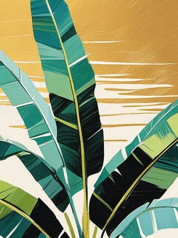 Dieses lebendige Kunstwerk zeigt eine auffällige Komposition aus üppigen, grünen tropischen Blättern, die wahrscheinlich von einer Bananenpflanze oder einer ähnlichen tropischen Flora stammen und sich von einem zentralen Punkt aus nach außen ausbreiten. Hinter dem Blattwerk bietet eine große, goldene Scheibe, die an eine Sonne oder den Mond erinnert, einen warmen, strahlenden Hintergrund, mit subtilen horizontalen Linien, die Lichtreflexe oder einen Horizont andeuten. Die Farbpalette setzt auf satte Grün- und Blautöne für die Blätter, die einen schönen Kontrast zum metallischen Glanz der goldenen Kugel bilden, und das alles vor einem weichen, hellen Hintergrund. Der Stil ist modern und grafisch und erweckt ein Gefühl von tropischer Gelassenheit und natürlicher Schönheit.