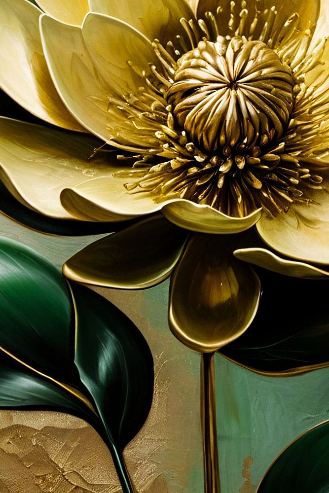 Dieses raffinierte Design erweckt eine elegante goldene Blume vor einem abstrakten, grün getönten Hintergrund zum Leben. Die raffinierten Details der Blütenblätter und Blätter strahlen Luxus und Wärme aus und eignen sich perfekt für eine moderne und stilvolle Einrichtung. Die Harmonie zwischen den glänzenden Goldtönen und den satten grünen Akzenten macht dieses Kunstwerk vielseitig und zu einem echten Blickfang. Ideal, um in jedem Raum eine beruhigende und zugleich luxuriöse Atmosphäre zu schaffen.