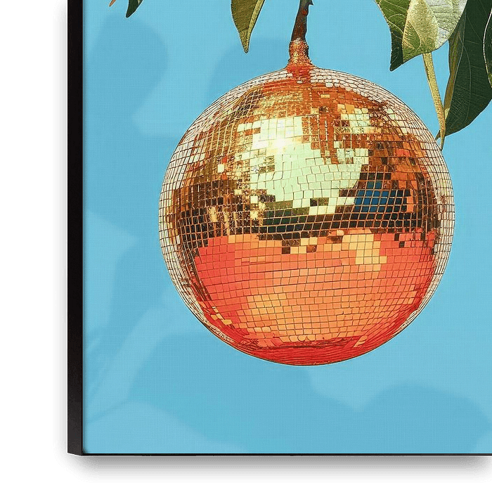 Dieses Kunstwerk fängt eine überraschende und harmonische Kombination aus Natur und moderner Ästhetik ein. In seinem Zentrum hängt eine schimmernde, goldene Discokugel an einem Zweig einer tropischen Pflanze.