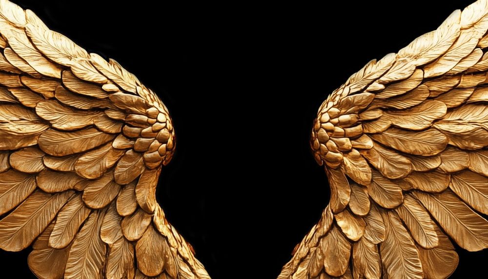 Goldene Engelsflügel Porträt-Panorama-Gemälde, das eine elegante und luxuriöse Ergänzung für jeden Raum sein wird. Mit seinem einzigartigen und stilvollen Look ist es ein echter Blickfang. Die brillanten Minimalfarben und das ungewöhnliche Design machen dieses Kunstwerk zu 100% einzigartig und originell. Es ist der perfekte Fotodruck, um Ihr Interieur zu vervollständigen.