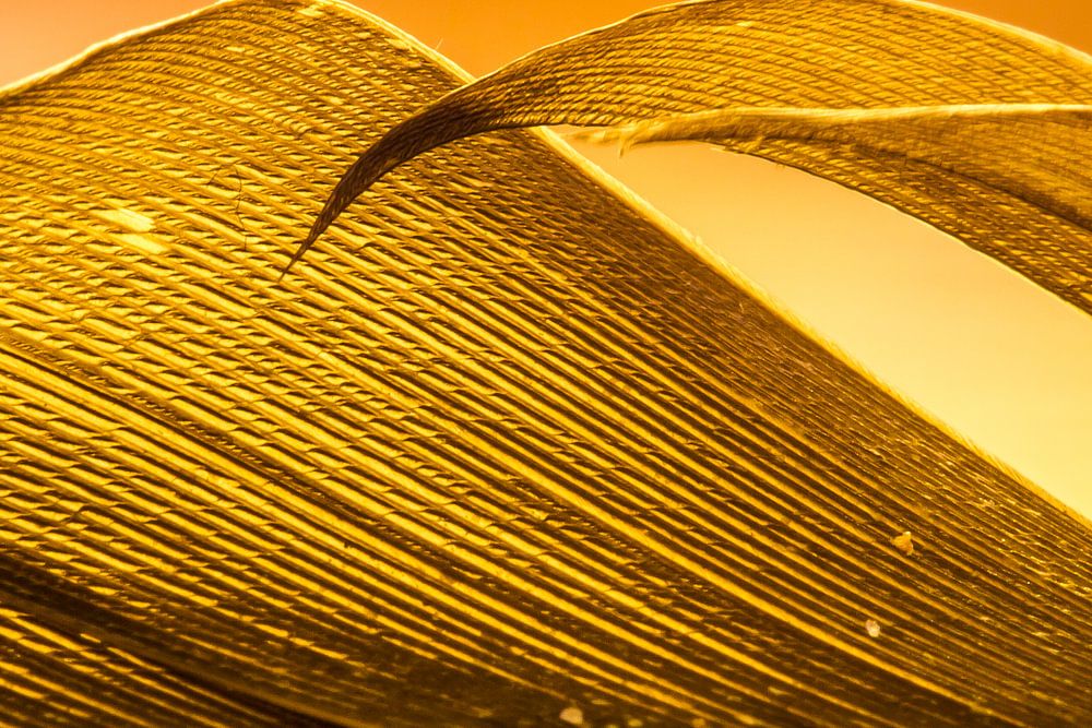Ein Ausschnitt einer Feder im goldfarbenen Gegenlicht