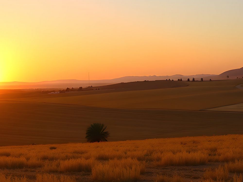 Das Bild zeigt eine wunderschöne Landschaft bei Sonnenuntergang. Die Sonne steht tief am Horizont und taucht die weitläufigen Felder in warme Gold- und Orangetöne. Sanfte Hügel und Berge rahmen die Szenerie, während vereinzelte Bäume im Vordergrund Schatten spenden. Die Felder sind in verschiedene Parzellen unterteilt, die durch ihre Farb- und Texturunterschiede faszinieren. Die ruhige Atmosphäre und die harmonische Farbgebung verleihen dem Bild eine friedliche und beruhigende Wirkung.