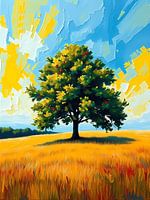 Ein lebhaftes, impressionistisches Gemälde zeigt einen einsamen, mit Früchten beladenen Baum, der stolz in einem weiten Feld mit goldenem, sonnengetränktem Gras steht. Der Himmel darüber ist eine dynamische Mischung aus leuchtend blauen und flauschigen weißen Wolken, akzentuiert durch gelbes Licht, das hinter den Wolken hervorbricht und…