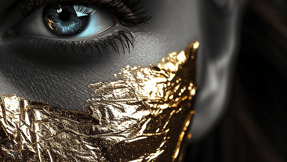 Die Essenz weiblicher Schönheit wird in diesem bezaubernden monochromen Porträt zum Leben erweckt. Eine Nahaufnahme des Gesichts offenbart die feinen Details von Ausdruck und Emotionen, während es teilweise mit Goldfolie bedeckt ist, was ihm eine unerwartete und faszinierende Dimension verleiht. Die Goldfolie, lebendig und brillant in der Farbe, kontrastiert mit der Tiefe des Schwarz-Weiß-Bildes und verbindet Realität und raffinierte Fantasie. Dieses von Geheimnis und Eleganz durchdrungene Foto fängt die zeitlose und einzigartige Anziehungskraft der weiblichen Seele ein, in der jeder Goldschimmer eine Geschichte von Kraft und Geheimnis erzählt.