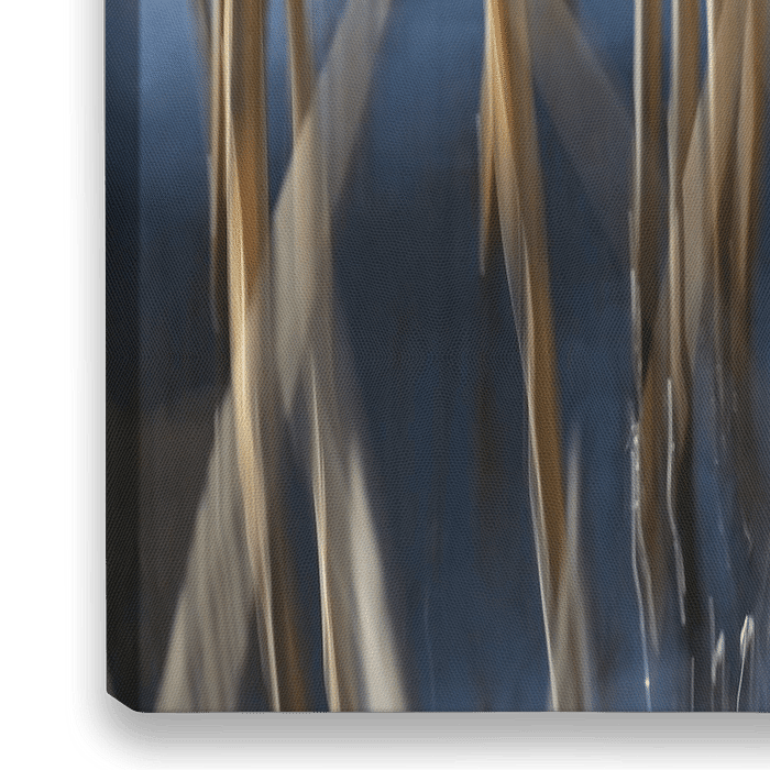 Bestelle dieses Blumen-Wandbild Goldene Schilfhalme in blauem Meerwasser verschmiert und in Bewegungsunschärfe bewegen sich im Wind, von Maren Winter als Reproduktion auf Leinwand, Alu-Dibond, als Poster, Fototapete oder Acrylglasbild.