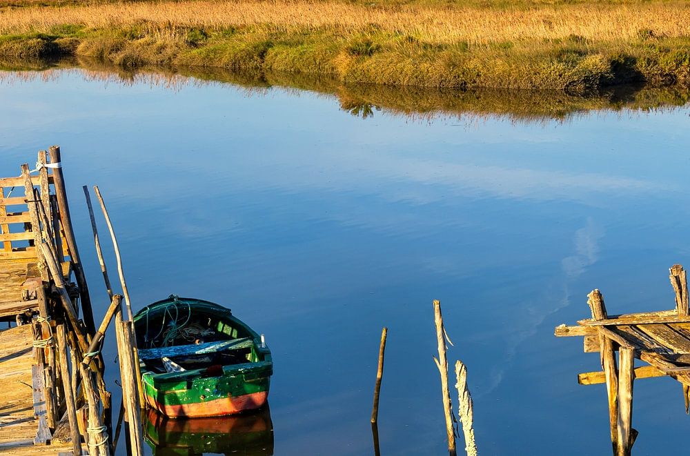 Die Stadt Carrasqueira liegt an der Lagune, die durch den Abfluss des Rio Sado entstanden ist. In der Vergangenheit haben die Fischer selbst alle möglichen Stege und baufälligen Gangways gebaut, um ihre Boote zu erreichen. Das Ergebnis ist ein Wirrwarr aus Pfählen und Brettern, das insgesamt einen sehr schönen und malerischen Anblick bietet. Dieses Foto wurde in der goldenen Stunde, kurz vor Sonnenuntergang, aufgenommen.
