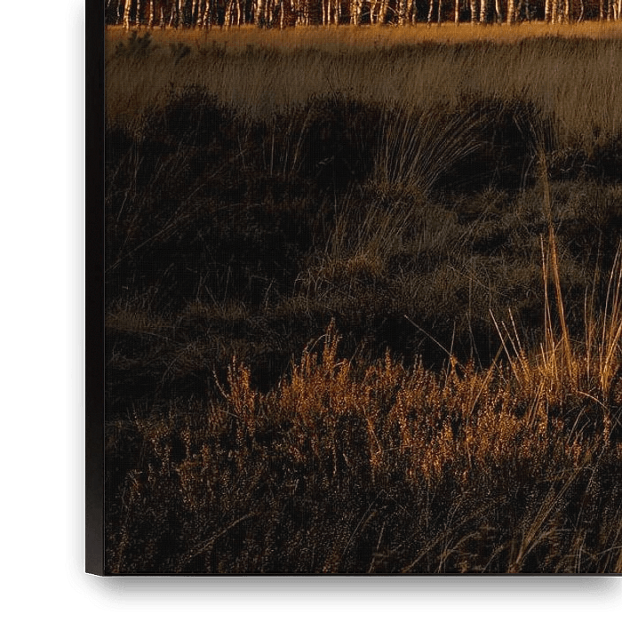 Ein schöner Winternachmittag im Park de Hoge Veluwe, wo zur goldenen Stunde die Birken in ihren Herbstfarben wunderschön im letzten Abendlicht stehen. Das Licht auf den Büscheln im Vordergrund verleiht dem Foto eine schöne Tiefe und Schichtung.