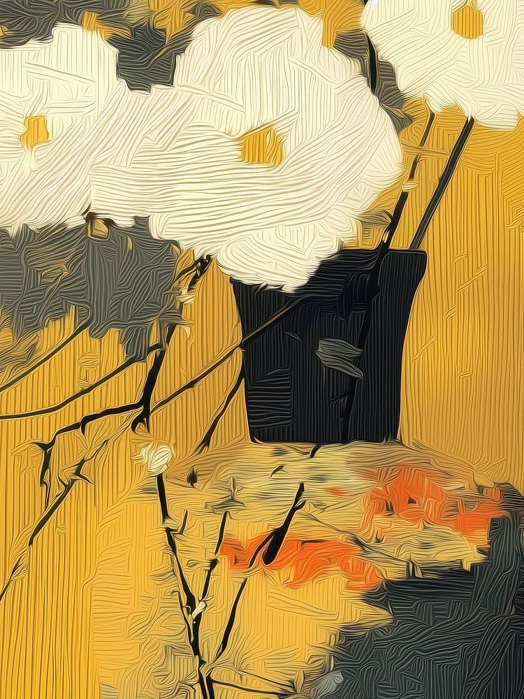 Weiße Blumen in einer farbenfrohen Vase vor einem warmen gelben Hintergrund, der moderne und traditionelle Blumenästhetik miteinander verbindet