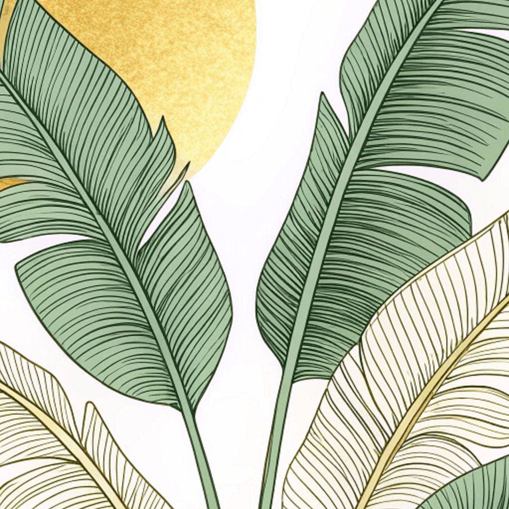 Eine elegante Illustration mit üppigen grünen und goldumrandeten tropischen Blättern, die sich vor einem golden schimmernden Vollmond oder einer Sonne in die Höhe recken. Das Design erinnert an einen botanischen Vintage-Charme mit einem modernen, künstlerischen Touch und eignet sich perfekt, um jedem Raum eine heitere und anspruchsvolle tropische Atmosphäre zu verleihen.