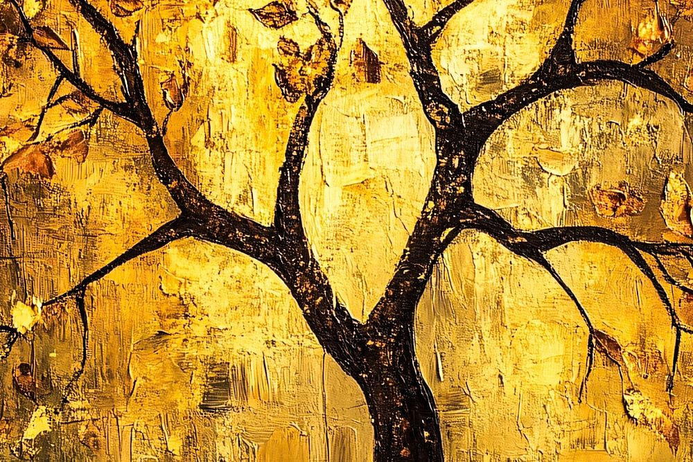 Dieses Kunstwerk strahlt mit seinen goldenen Farbtönen und seiner raffinierten Textur Wärme und Eleganz aus. Das Design zeigt einen majestätischen Baum mit verstreuten Blättern in einem abstrakten Stil, der perfekt zu modernen Interieurs passt. Die goldenen Farben und subtilen Kontraste bringen eine luxuriöse und ruhige Atmosphäre in jeden Raum. Das Gemälde eignet sich ideal zur Dekoration von Wohn-, Schlaf- oder Esszimmern und verleiht ihnen einen Hauch von Raffinesse und Kunstfertigkeit. Das Bild lädt zum Betrachten und Bewundern ein und bildet einen schönen Blickpunkt im Raum.