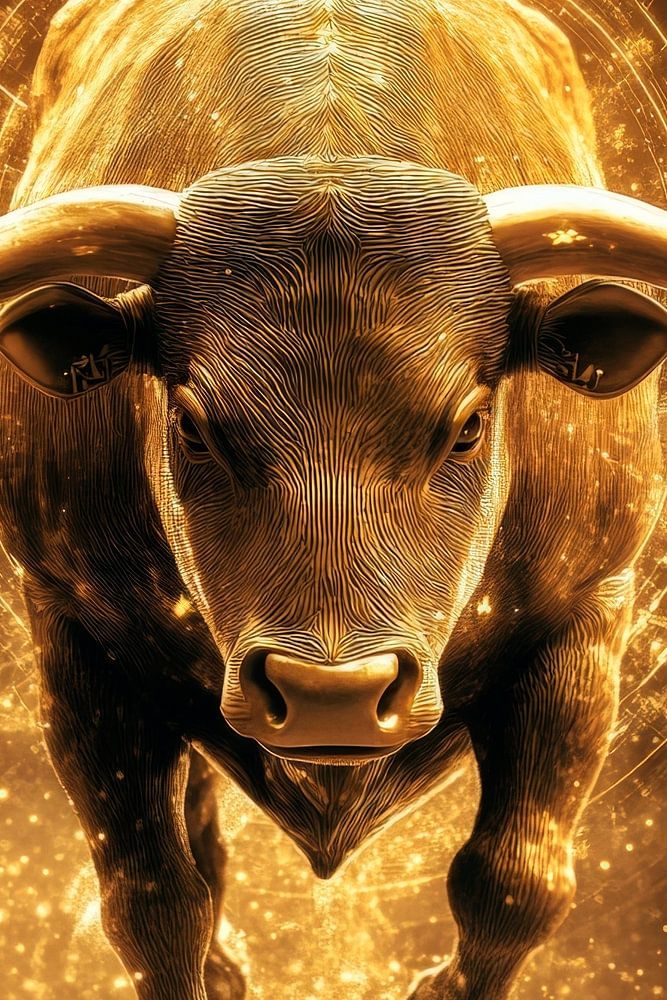Ein kraftvoller goldener Stier durchbricht die futuristische Kulisse, seine Präsenz strahlt Stärke und Entschlossenheit aus. Umgeben von pulsierenden digitalen Elementen vermittelt er ein Gefühl von Dynamik und Energie. Ideal für das Büro, inspiriert er zu neuen Ideen und motiviert zu leistungsstarken Entscheidungen.