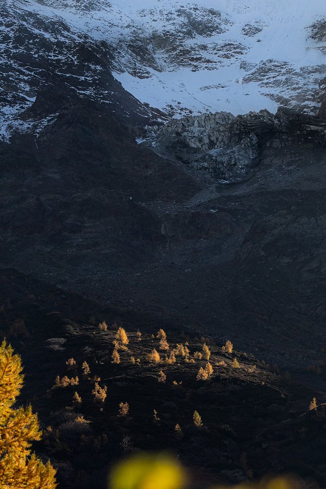 Goldene Lärchen vor Walliser Alpenlandschaft