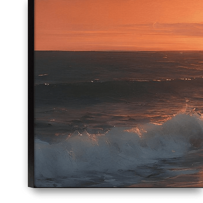 Ein Gemälde eines wunderschönen Sonnenuntergangs am Strand, bei dem der Himmel und das Meer in leuchtenden Farben gemalt sind und die Wellen an das Ufer schlagen