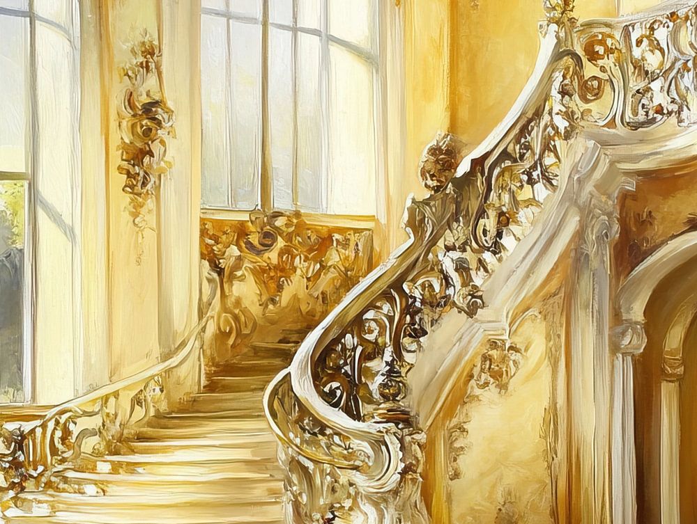 Goldener Saal | Rokoko-Lichtspiel - Dieses architektonische Gemälde zeigt einen opulenten, vom Rokoko inspirierten Treppensaal mit auffälligen goldenen Akzenten, hohen Fenstern und sanft einfallendem Tageslicht, das dem Raum eine verträumte Atmosphäre verleiht.