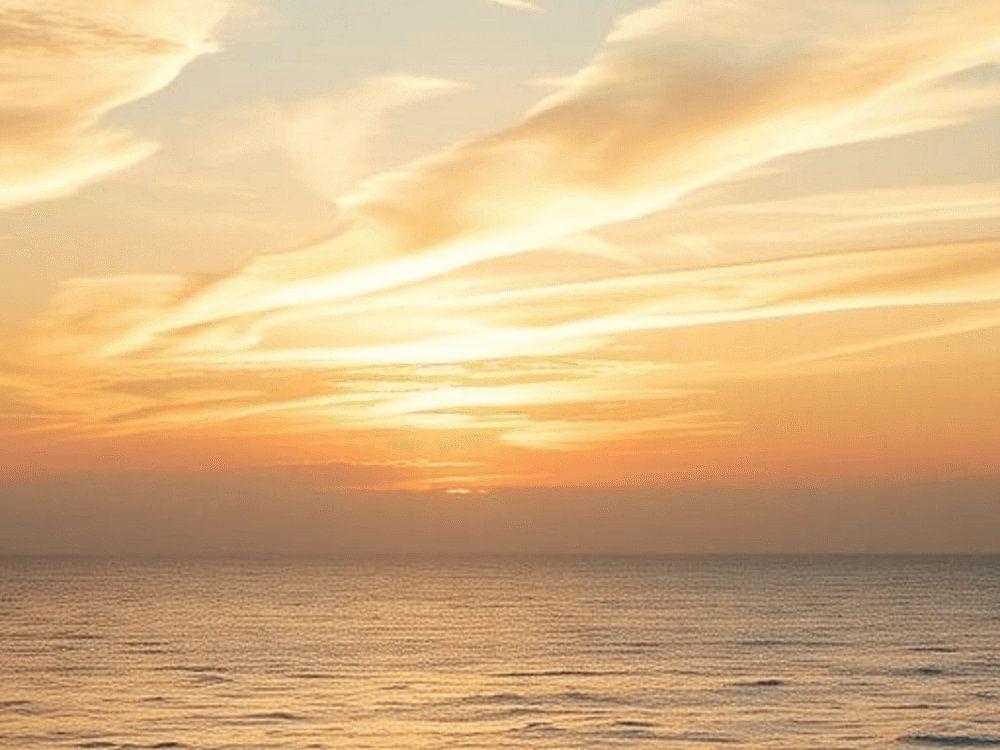 Dieses atemberaubende Bild fängt die ruhige Schönheit eines Sonnenuntergangs über dem weiten Meer ein. Der Himmel leuchtet in warmen Orange- und Goldtönen und malt streifige Wolken, die sich über den Horizont erstrecken. Unten schimmert das Meer in den Reflexionen der untergehenden Sonne, und die sanften Wellen bilden ein faszinierendes Muster. Es ist ein heiterer und zeitloser Moment, der ein Gefühl von Frieden und Verwunderung hervorruft.