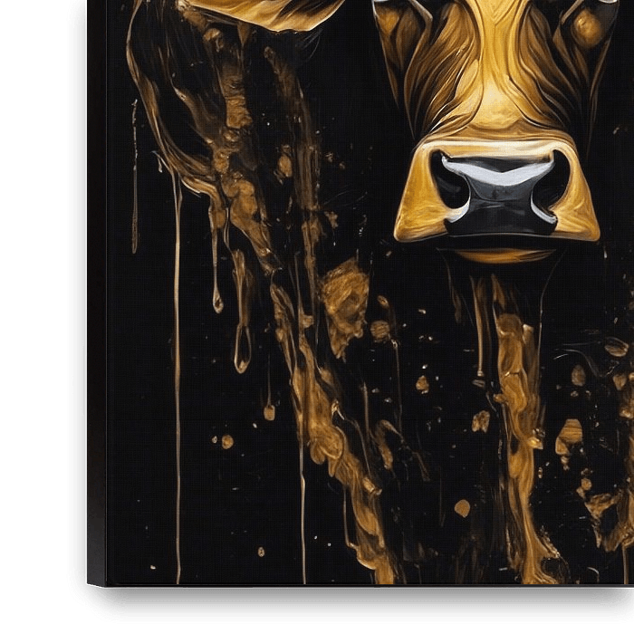 Porträt eines goldenen Stiers mit großen Hörnern. Abgebildet vor einem dunklen Hintergrund. Sieht toll aus, wenn Sie schwarze Akzente in Ihrem Interieur haben.