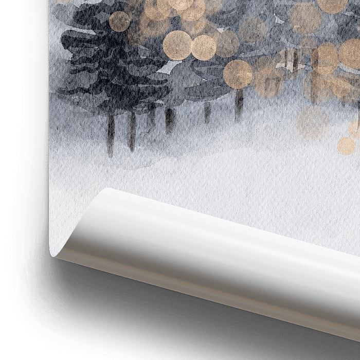 Composing aus Malerei und Fotoeffekt mit verschneitem Winterwald und goldenen Lichtern. Wunderschön als Winterdekoration