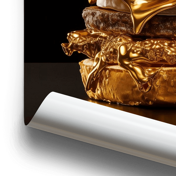Dieses Kunstwerk zeigt ein goldenes Hamburgerbrötchen. Der Käse ist geschmolzen und sieht aus wie geschmolzenes Gold. Das Brötchen ist ebenfalls aus Gold. Das Brötchen spiegelt sich im Vordergrund. Der Hintergrund ist schwarz.