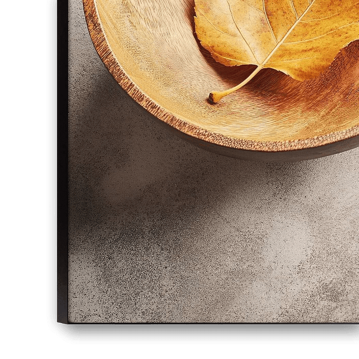 Dieses schöne, minimalistische Design strahlt eine heitere, herbstliche Atmosphäre aus. Ein einzelnes goldenes Herbstblatt liegt in einer rustikalen Holzschale und bildet eine einfache, aber stilvolle Komposition. Die natürliche Farbpalette aus warmen Braun- und Goldtönen vermittelt ein Gefühl von Ruhe und zeitloser Eleganz, perfekt für Innenräume, die einen dezenten und natürlichen Look suchen. Dieses Design passt wunderbar in ein Wohn- oder Esszimmer und bringt einen Hauch von Herbst in jeden Raum. Ein ideales Dekorationsstück für Menschen, die Schlichtheit lieben und die Schönheit der Natur in ihrem Interieur hervorheben möchten.
