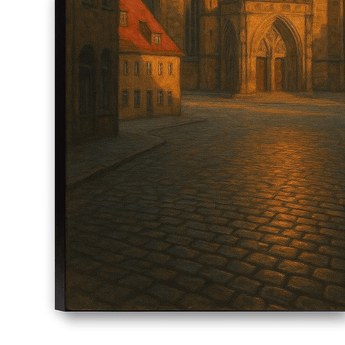 Das goldene Sonnenlicht wärmt die Fassaden, während das sich vertiefende Blau des Abends die Komposition in zeitlosem Kontrast einrahmt. Die Geometrie der Straße, der hoch aufragende Turm der Kathedrale und die Leere des Platzes schaffen ein emotionales Gleichgewicht zwischen Erhabenheit und Einsamkeit. Es ist ein Porträt des Friedens in der Beständigkeit - ein Gefühl, das noch lange nachhallt, nachdem man aufgehört hat, hinzusehen.