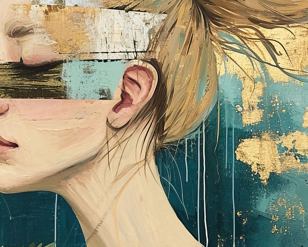 Golden Mystery - Dieses Porträt zeigt eine Frau im Profil, deren Augen von einem schwarzen Balken verdeckt werden, was ihr ein geheimnisvolles Aussehen verleiht. Ihre Hauttöne kontrastieren wunderschön mit dem gold- und türkisfarbenen Hintergrund, der sich in ihrer Kleidung fortsetzt und eine mehrschichtige Textur erzeugt. Patronale Pflanzenelemente verstärken das natürliche, organische Gefühl des Werks.