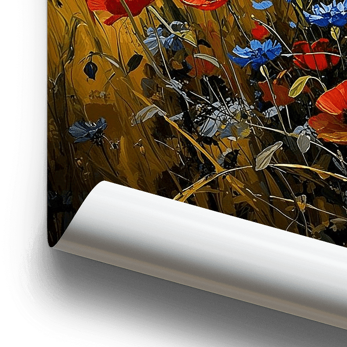 Ein goldenes Feld mit blühenden Ähren und tiefroten Mohnblumen und leuchtend blauen Kornblumen.
