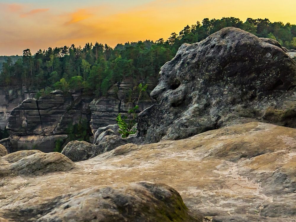 Die Sonne ist längst untergegangen, stattdessen tut sich nun der Mond über der Hinteren Sächsischen Schweiz hervor. Während es oben auf dem Felsplateau der Goldsteinaussicht noch hell ist und den Himmel bunte Lichter erfüllen, durchzieht den Wald zwischen den Felsen bereits das Schwarz der Nacht. Ein eindrucksvoller Kontrast.