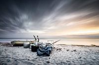Fischerboot und -ausrüstung am Strand von Vitte, Insel Hiddensee.
