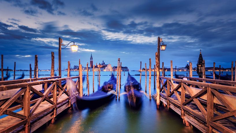 Auf diesem stimmungsvollen Foto bewegt sich Venedig im Rhythmus des Abends. Während sich der Himmel langsam in die tiefblauen Farbtöne der blauen Stunde verwandelt, tanzen die Gondeln sanft auf dem Wasser - eingefangen mit einer langen Verschlusszeit, die ihre Bewegung fast traumhaft erscheinen lässt.