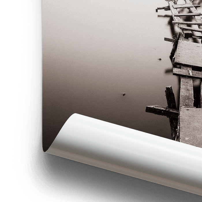 Ein Heißluftballon startet von einem verfallenen Steg, sepiafarben und im alten Kinostil.