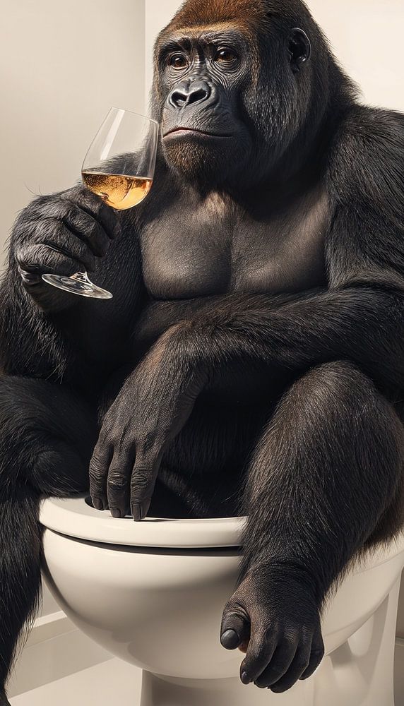 Setzen Sie sich... oder besser noch, lassen Sie diesen schicken Gorilla das für Sie tun. In diesem unnachahmlich surrealen Kunstwerk sehen wir einen imposanten, stoischen Gorilla, der auf einer Toilette sitzt und ein Glas Wein in der Hand hält - den kleinen Finger stolz erhoben. Seine Körperhaltung ist ebenso entspannt wie königlich.